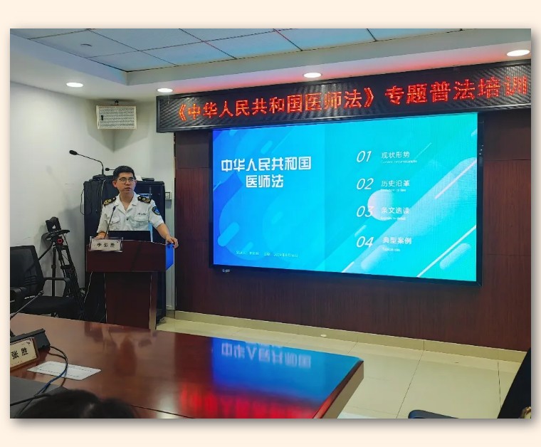 为进一步规范医疗机构执业行为,提升医务人员法律素养,保障医疗服务质量与安全,8月16日,在第七个中国医师节来临之际,买世界杯的网站组织开展《中华人民共和国医师法》专题普法培训,特邀温州市疾病预防控制中心(温州市卫生监督所)法治稽查处副处长李张胜来院授课。