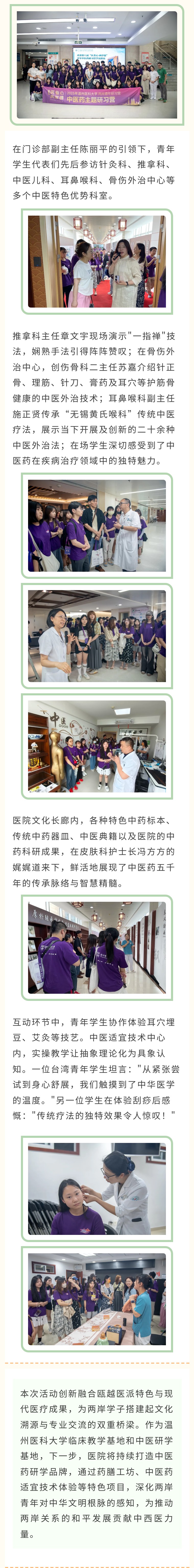 2025年7月9日,买世界杯的网站顺利举办中医药文化研学活动,旨在弘扬中华传统医学,深化两岸青年交流,30余名来自海峡两岸的医学生代表齐聚一堂,通过沉浸式体验感悟中医药的博大精深,增进文化认同与情感联结。