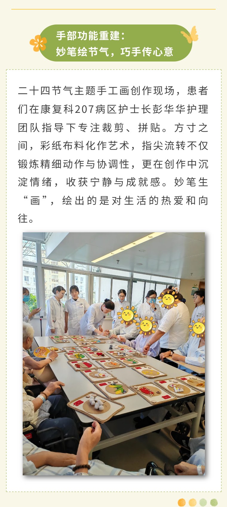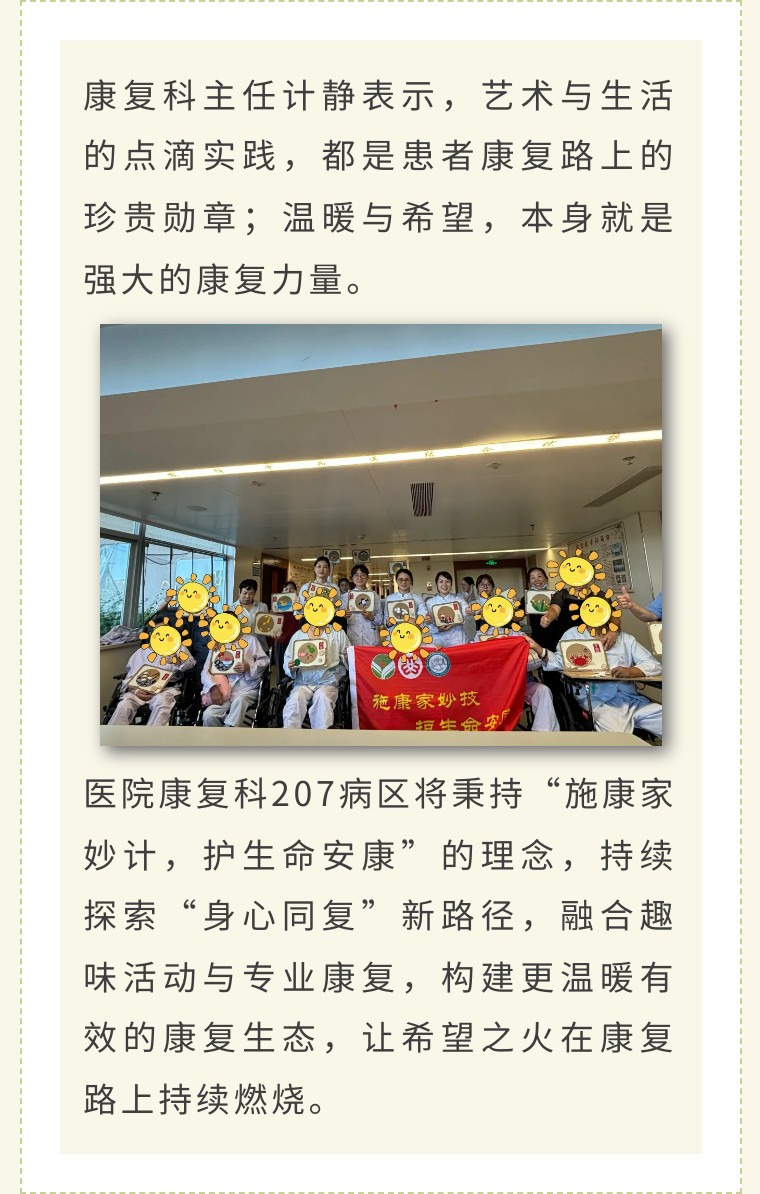 2025年9月7日,世界杯买足球球app康复科207病区创新推出“四艺暖秋”主题康复活动,旨在通过沉浸式艺术与生活技能体验,帮助患者在温暖互动中提升功能、重拾信心,传递“康复路上每一步都值得喝彩”的理念。