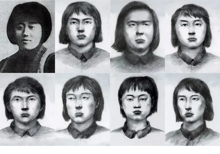 “八女投江”八名女战士的肖像拼版照片:左上为冷云生前照片;其他七名女战士为速写画像,生前未留下照片。新华社发
