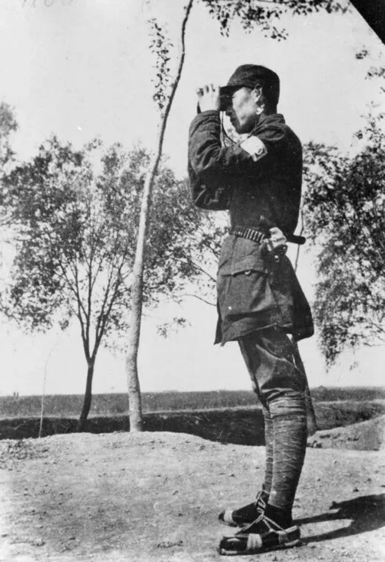 彭雪枫在阵地前察看敌情。新华社发