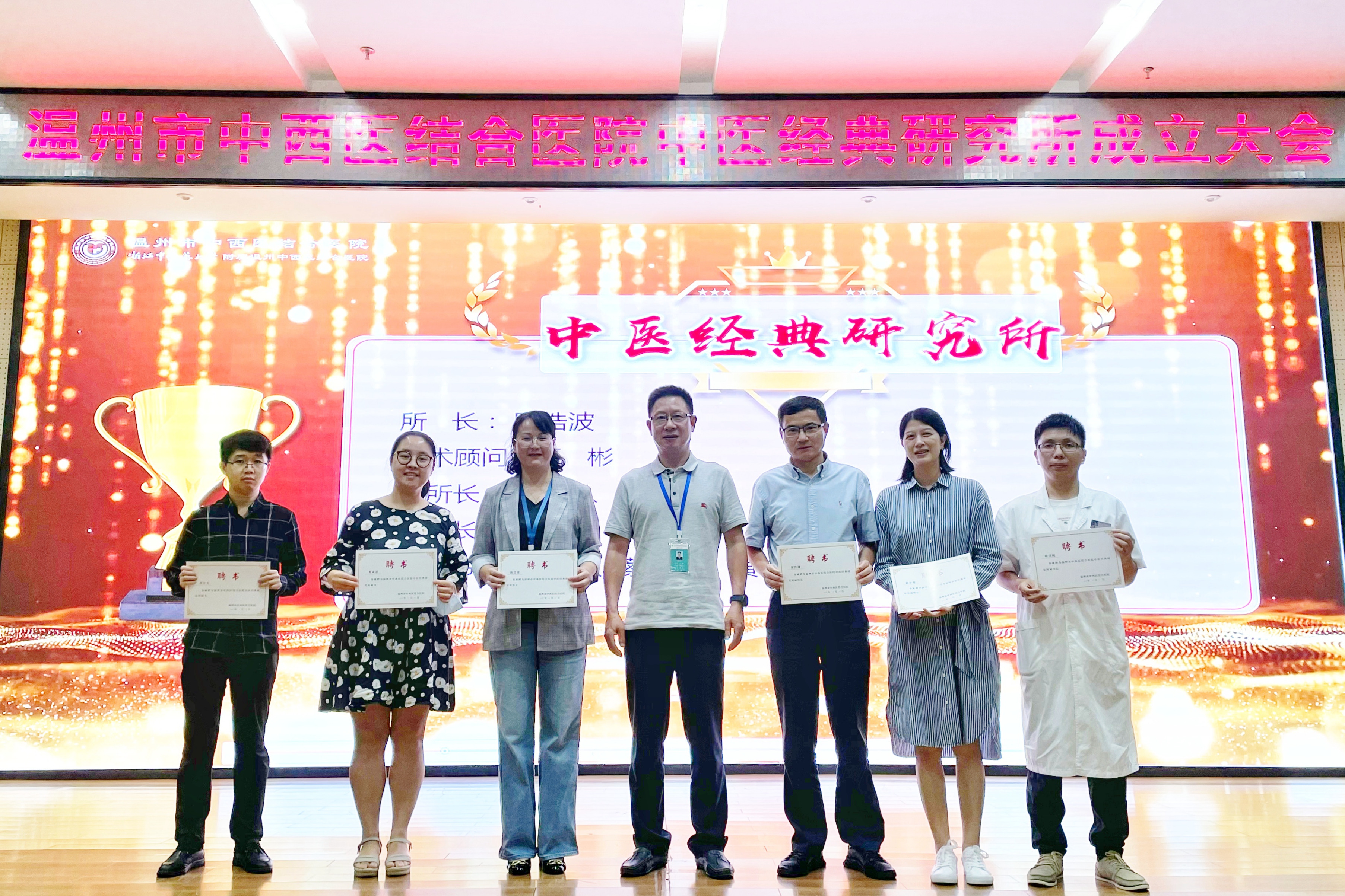王彬向中医经典研究所所长陈浩波、副所长谢作钢、赵小迎,秘书长欧洋帆,秘书蔡彬彬、蔡成思、黄佳杰颁发聘任证书。