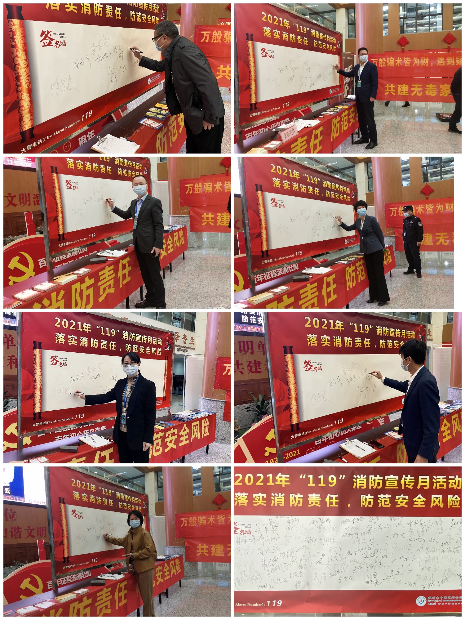 保卫科工作人员向医护人员以及群众进行消防安全知识和消防设施使用方法培训指导,并邀请参加活动的人员在“119”宣传墙上签字,营造浓厚消防宣传氛围。