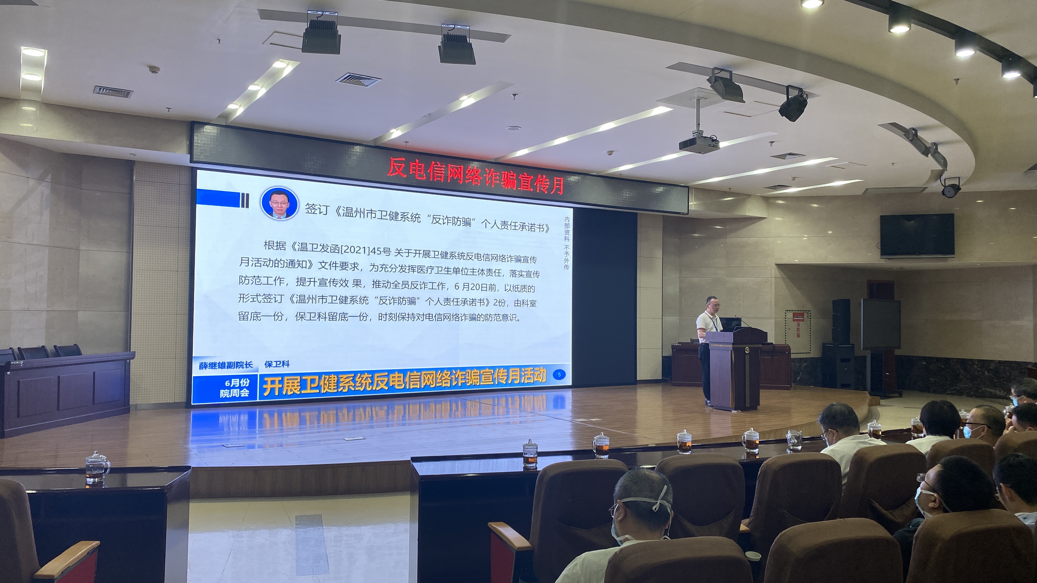 为认真贯彻《温州市卫生健康委员会关于开展卫健系统反电信网络诈骗宣传月活动的通知》精神,有效遏制电信诈骗高发势头,进一步增强医院职工防骗、识骗、拒骗意识,推动防诈骗宣传工作的深入发展,6月10日,世界杯买足球彩用哪个app正规开展全院防诈骗宣传讲座,全院中层干部参加讲座。副院长薛继雄在讲座中讲解了防诈骗经典案例、防诈骗处理方法、法律法规知识。