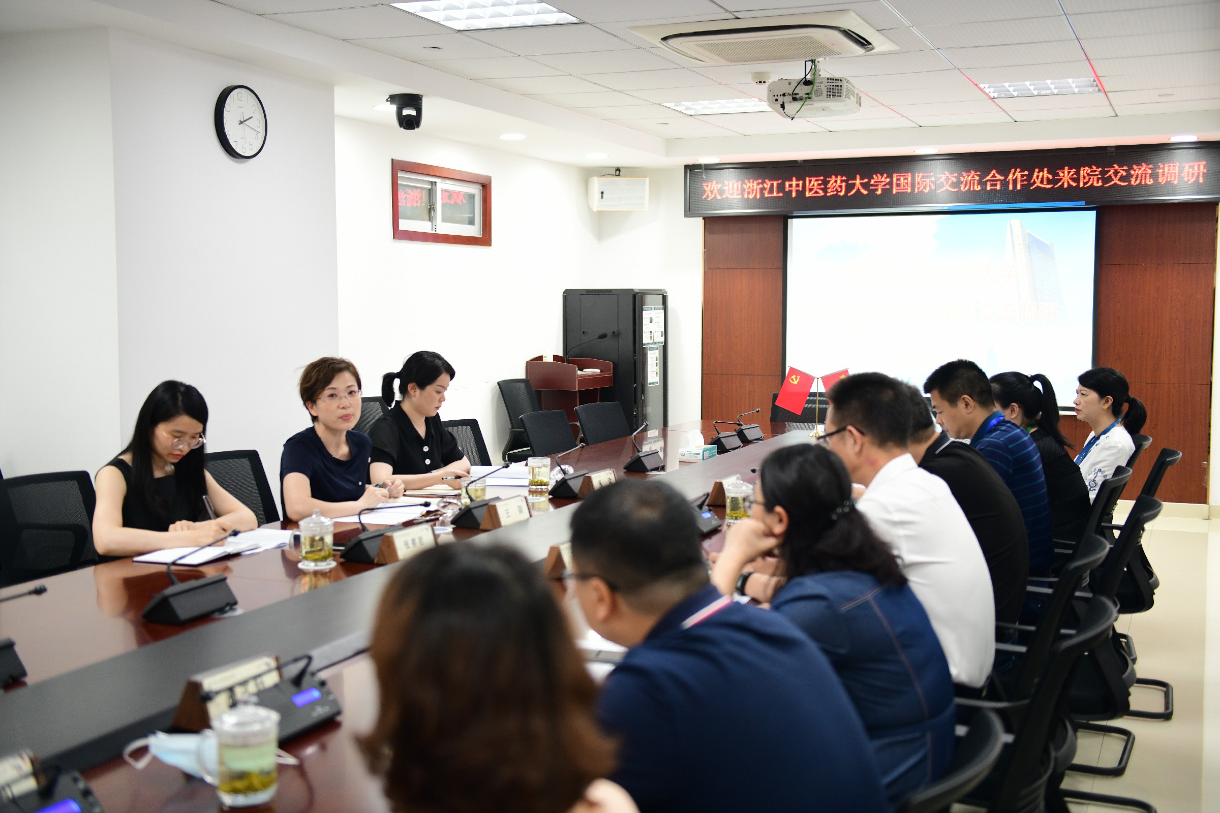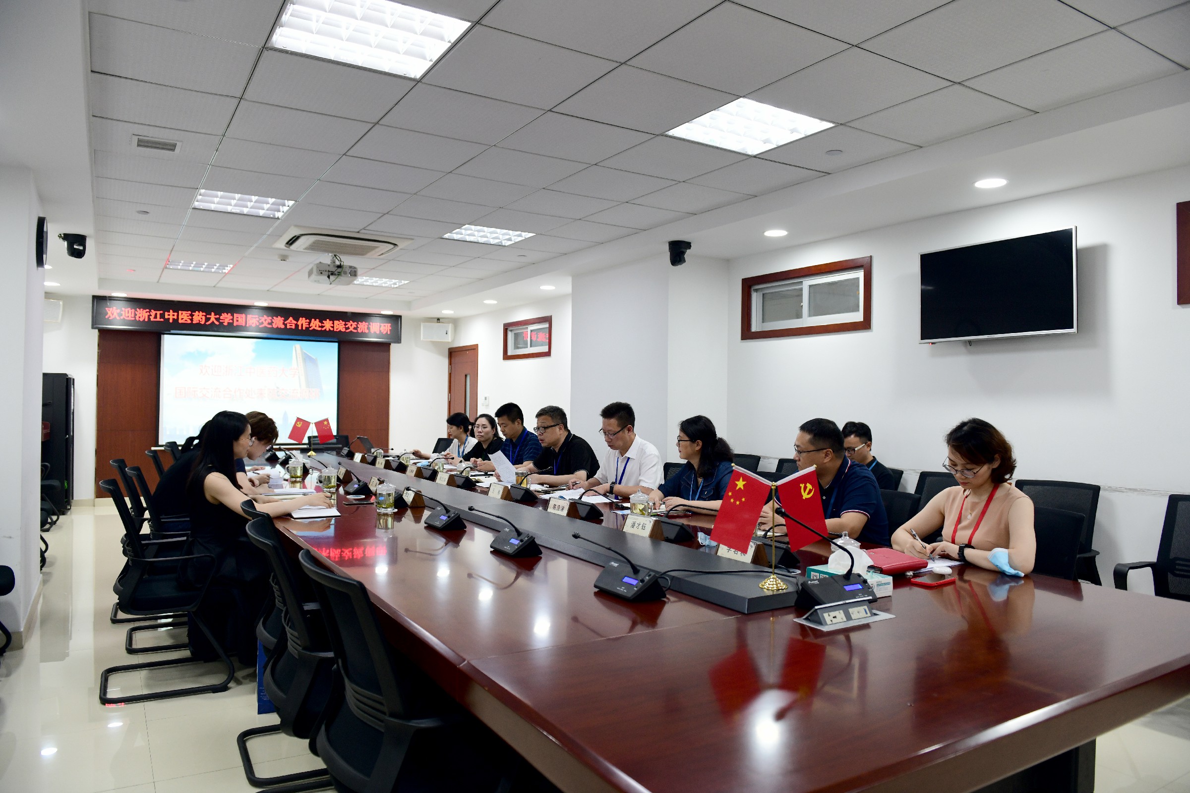 2021年7月9日,浙江中医药大学国际交流合作处王颖等一行来世界杯买足球彩用哪个app正规调研,市中西医党委书记郑文球、院长王彬等出席调研会议。