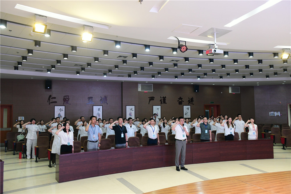仪式的最后,在党委委员陈冠儒的带领下,全体医护人员换上崭新的白大衣,高举右手,庄严宣誓:健康所系,性命相托。我将竭尽全力,除人类之病痛,助健康之完美,维护医学的圣洁和荣誉,尊重生命,救死扶伤。人文人道 ,仁医仁术。恪守医德,敬业至善。执着追求,精益求精。团结互助,共倡和谐。仁爱、至诚、严谨、奋进,我决心为中西医的明天不懈努力,为祖国医药卫生事业,为人类身心健康,奋斗终生!