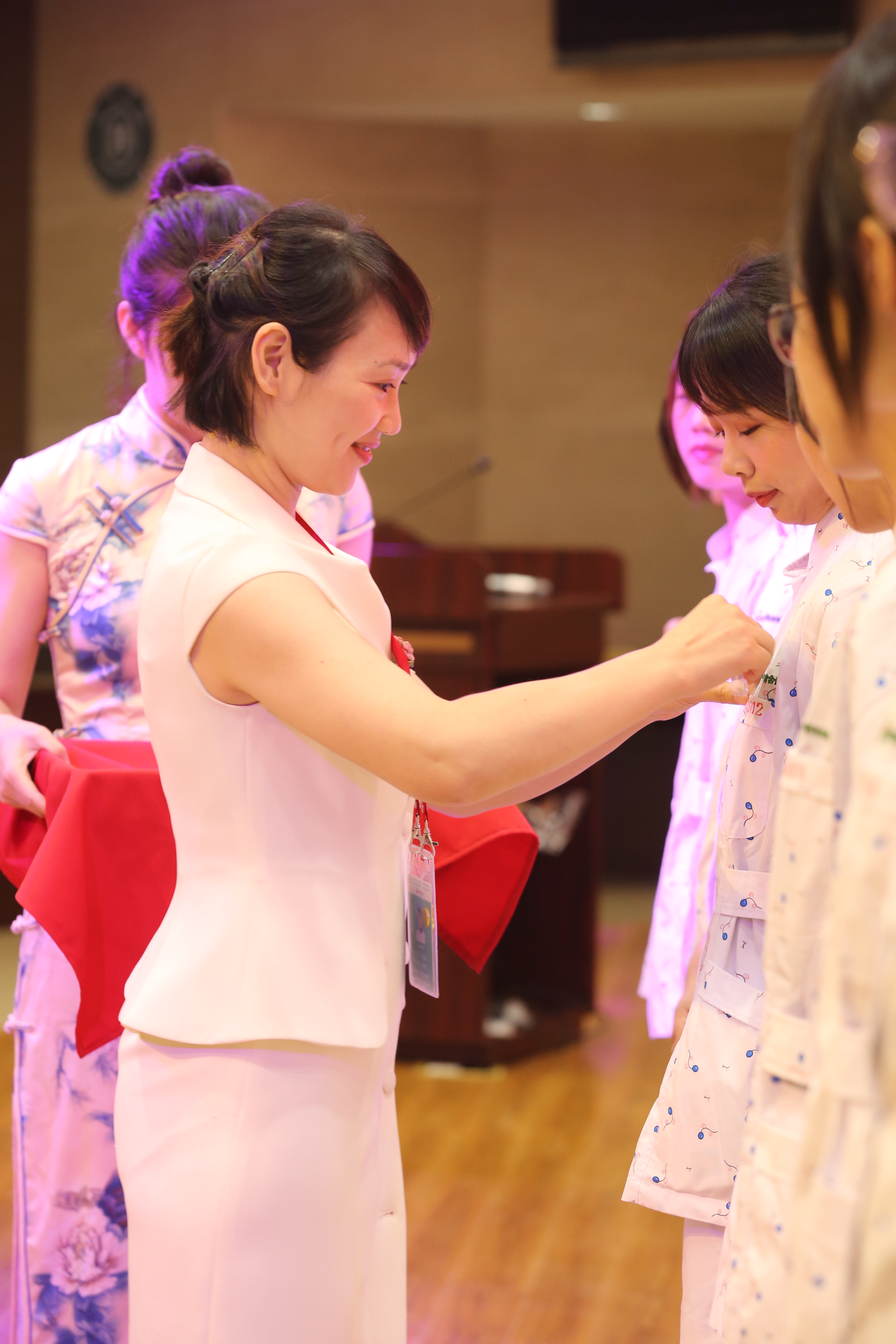 一周培训圆满结束,通过考核合格,每位新员工拿到了自己的结业证书。随后的科室认领仪式中,总务科、财务科、信息科、护理部、医务科、人事科、宣统科、党政综合办的科长们分别为自己部门的新员工佩戴上胸牌,发表感人肺腑的入职寄语,整个仪式温情又感人。