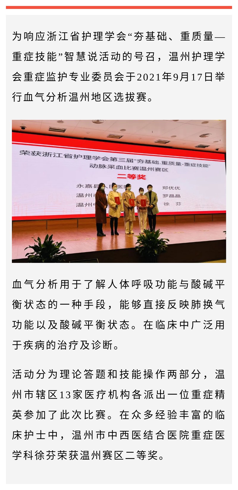 市中西医徐芬在浙江省护理学会行血气分析温州地区选拔赛中获佳绩