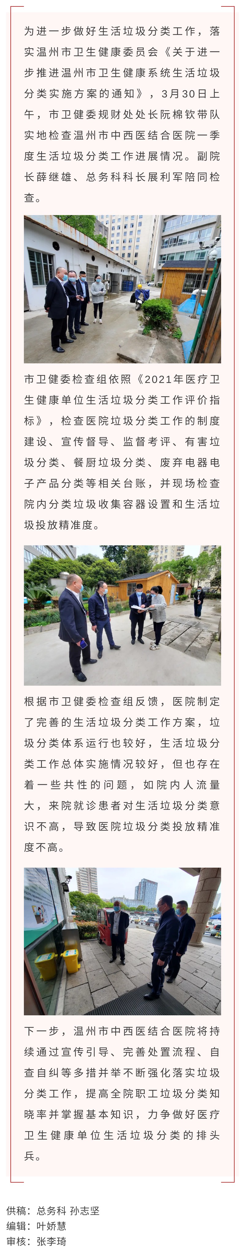 温州市卫健委到市中西医检查2022年一季度生活垃圾分类工作