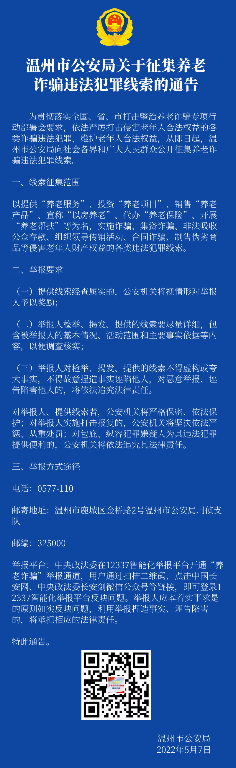 温州市公安局关于征集养老诈骗违法犯罪线索的通告