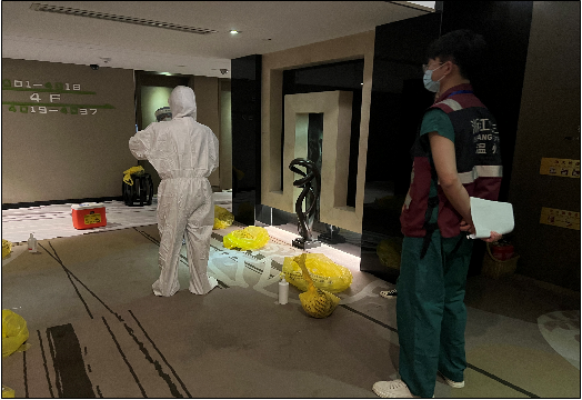 中队长通知队员带好物资立即集结。按照“五快”要求,参加演习的4个作战单元迅速清点物资,与民警快速定位密接对象,确认具体地址、人数后,到达对象所在地址后进行标本安全规范化采样、脱防护服、安全快速转运交接标本、处置医废、完成车辆人员消杀工作。以上每一步骤都设置现场考官以及场外观察员进行量化评分。