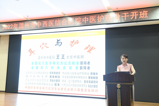 仪式后,全国耳穴诊治专业委员会常委、中国耳穴临床治疗研究组组长、浙江省名中医王正教授详细讲授了开班课程《耳穴与护理》。