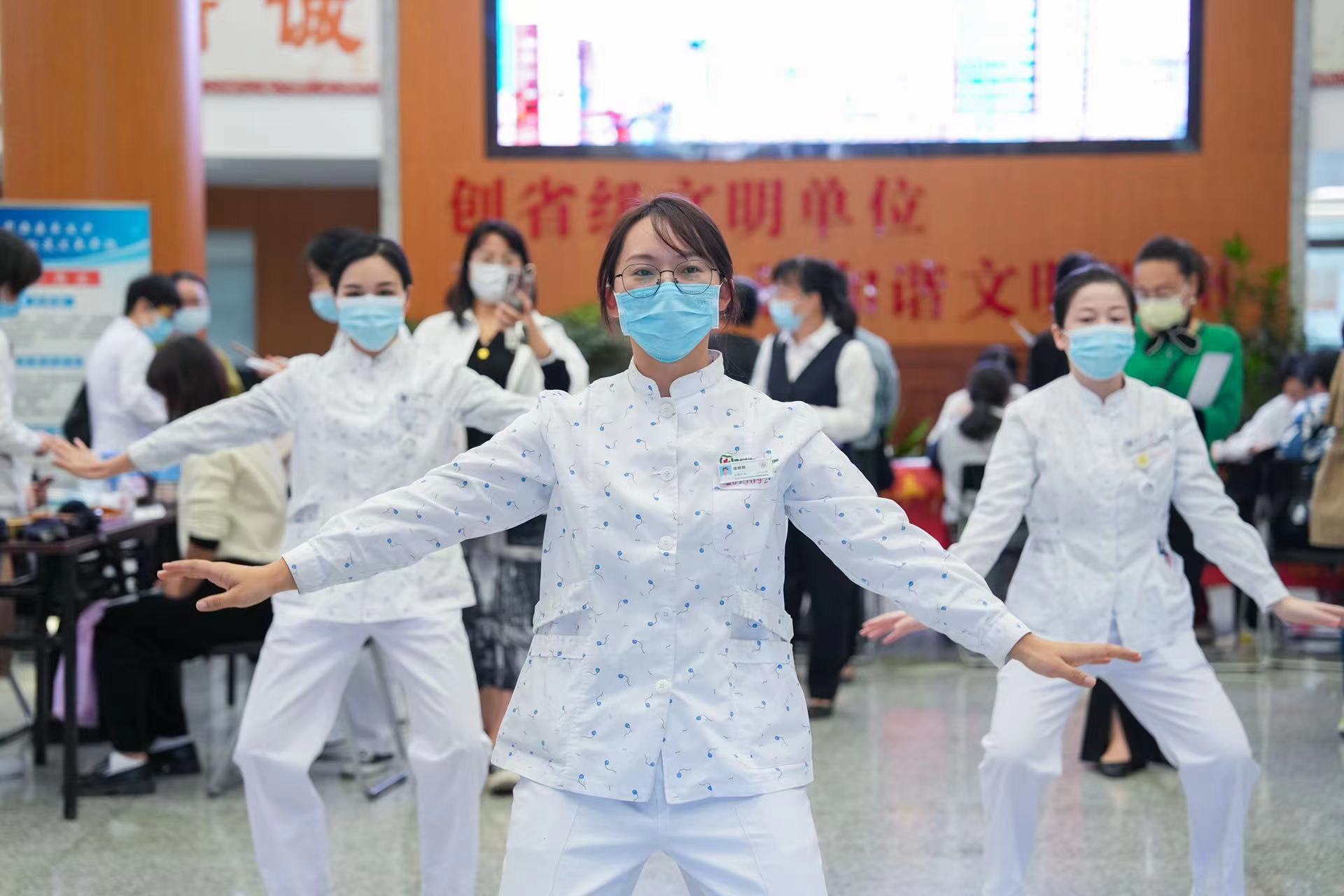 八段锦现场表演,为现场患者进行动作指导,以达到改善肌肉关节活动、改善体质、提高抗病能力的作用。