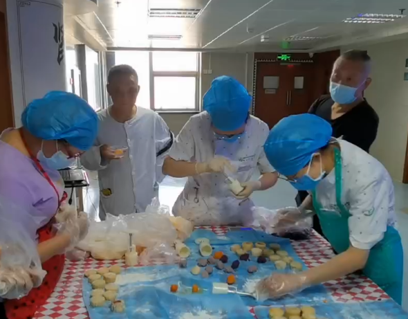 活动结束,医护将亲手制作的月饼及清凉粉送至每一位患者,并送上节日的祝福。患者也深刻体会到医护的用心,以表感谢。穿上白大褂,医患是并肩作战对抗病魔的战友,系上围裙,医患是相亲相爱关心体贴的家人。