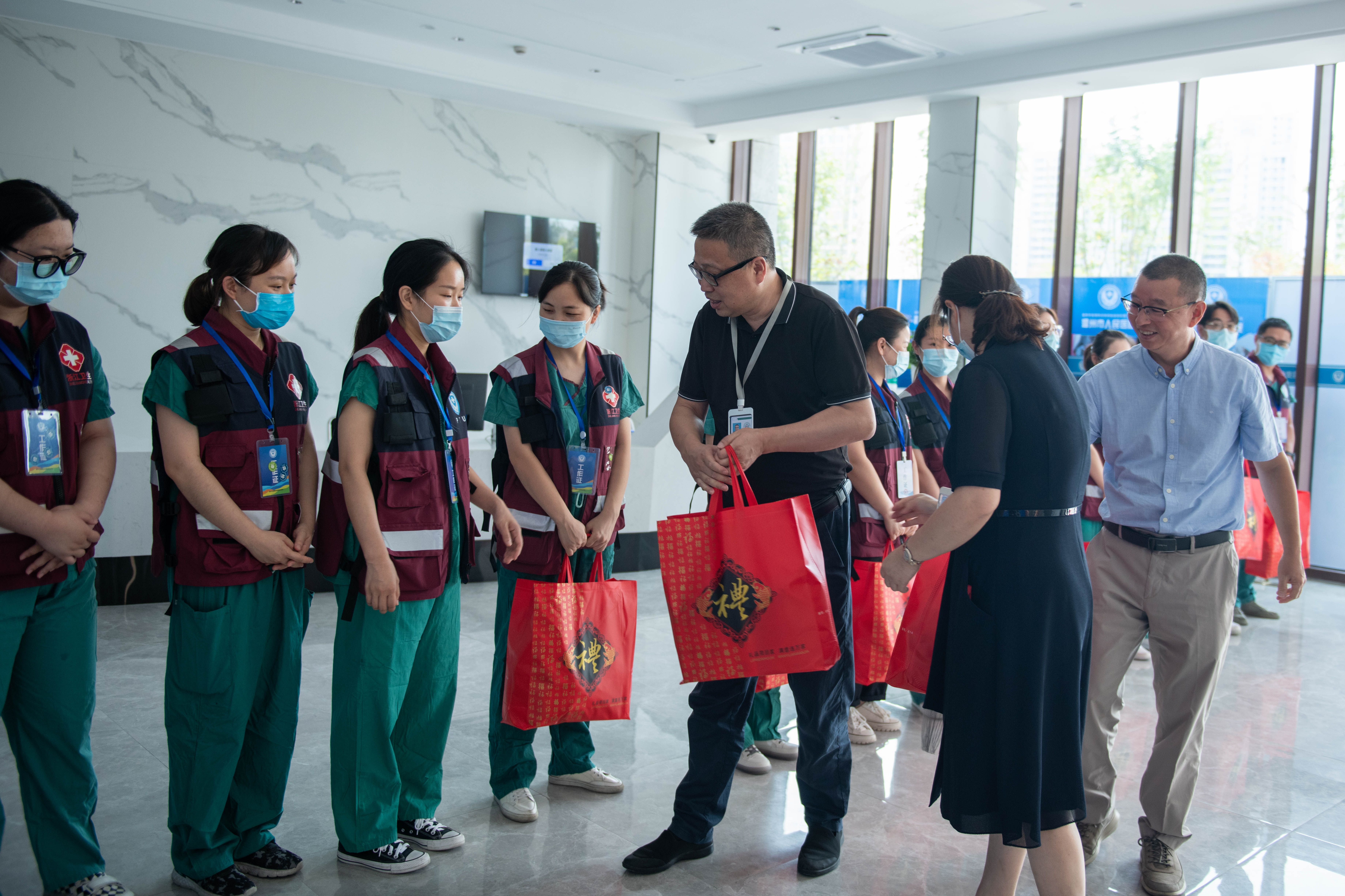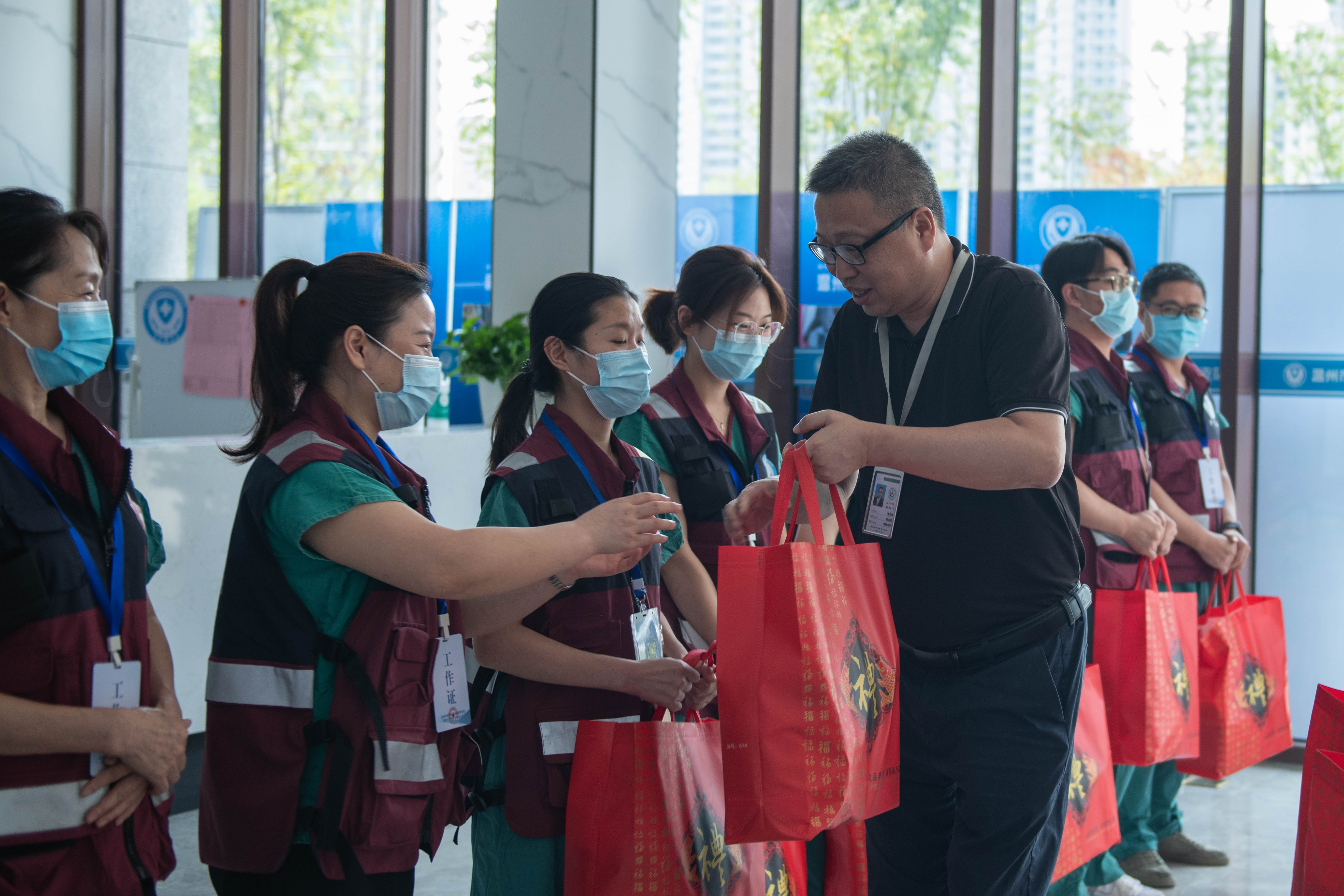 “节日快乐,你们辛苦了!”慰问组为每一位队员送上慰问品,预祝他们开心度过即将到来的国庆、中秋“双节”,同时还参观了温州市疫情防控特别支队新搬迁后的基地。