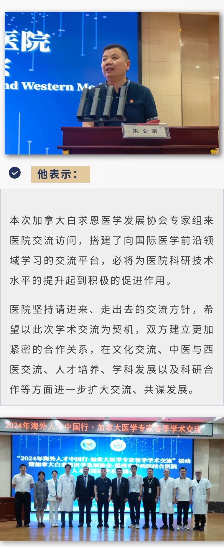 会上,朱文宗在致辞中向不远万里来院开展学术交流活动的加拿大医学专家表示热烈欢迎和衷心感谢。