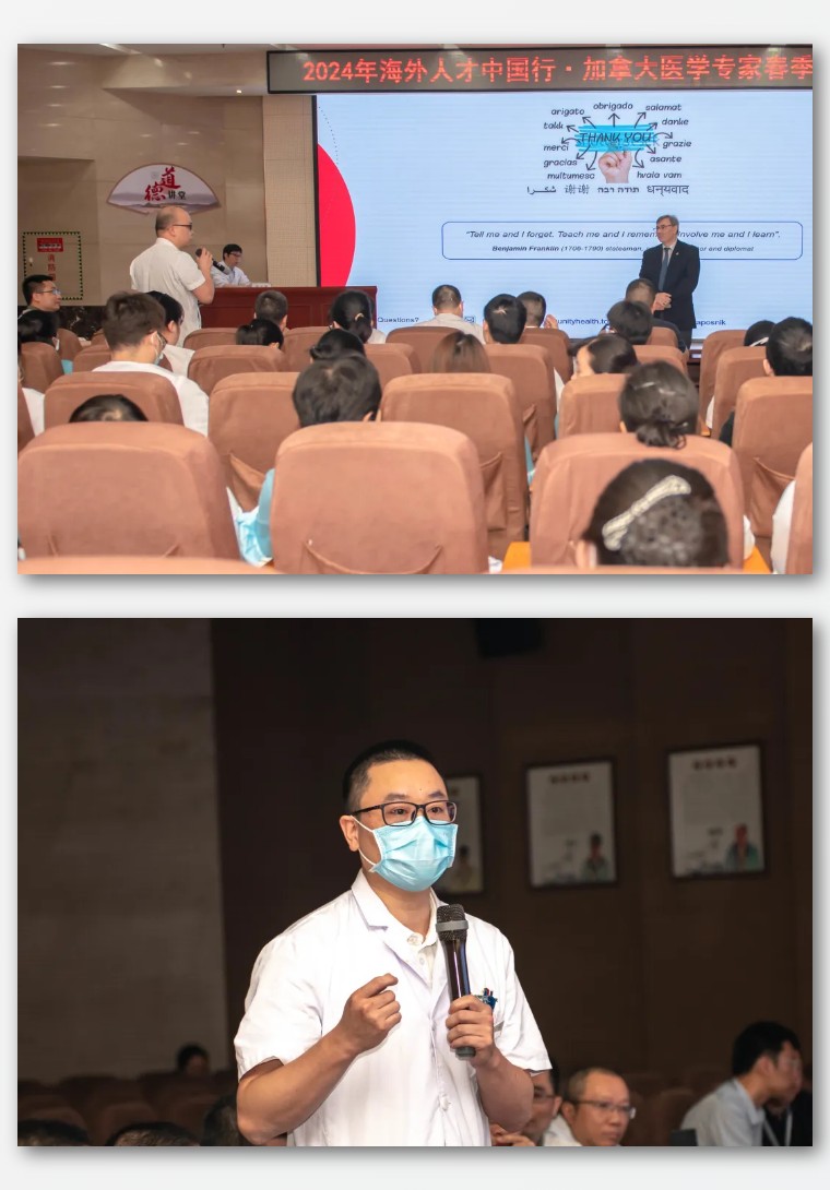 多伦多大学神经学家、高级科学家和医疗保健顾问Dr.Gustavo Saposnik,加拿大白求恩医学发展协会编辑部主任Dr.Qiuwang Zhang,检验科医务专业人士Ms.Hai Yan,医院党委书记朱文宗出席学术交流现场。医院党委委员、副院长程斌主持会议。