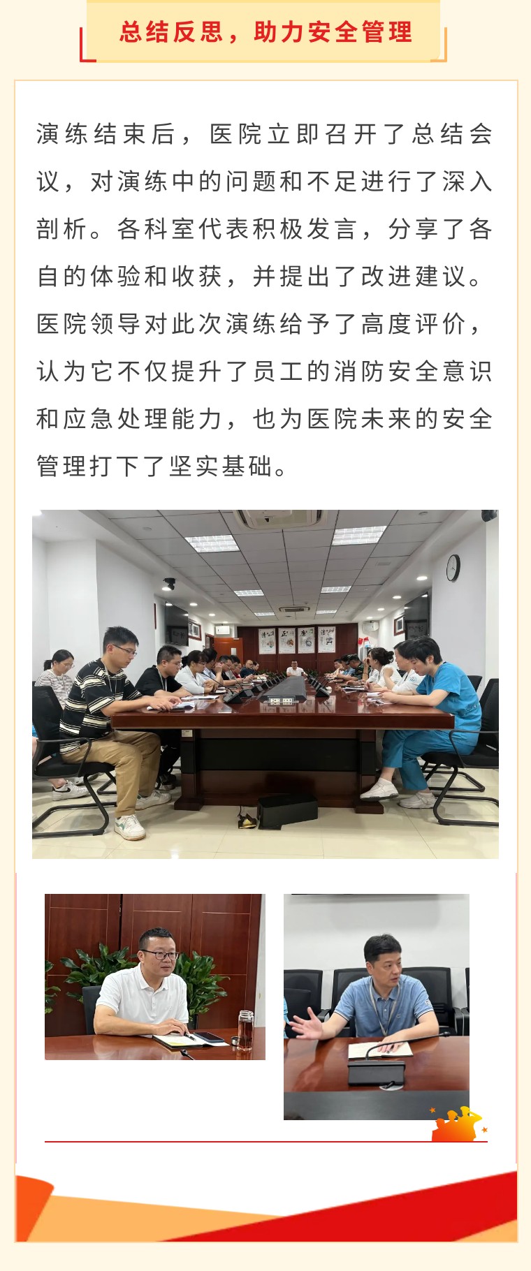 此次大型全院消防演练活动的成功举办,充分彰显了医院对消防安全工作的高度重视。下一步,医院将继续以高度的责任感和使命感,全面推进各项安全生产管理工作,为广大患者和职工提供一个安全、和谐的环境。