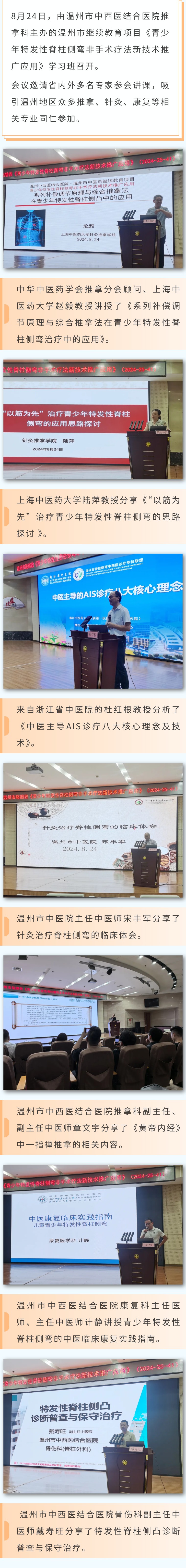 专家们还就青少年特发性脊柱侧弯非手术疗法的诊治及相关中医适宜技术在基层单位的推广进行了深刻的探讨,分享了自己多年的工作经验,授课形象生动。
