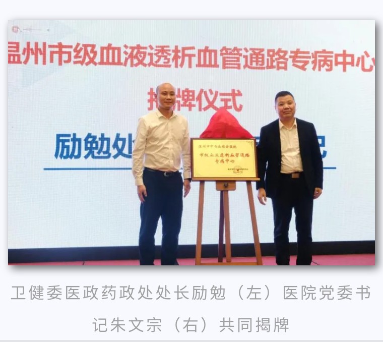 开幕式后随即举行了“温州市级血液透析血管通路专病中心”揭牌仪式,温州市卫生健康委员会医政药政处处长励勉和买世界杯的网站党委书记朱文宗共同揭牌。