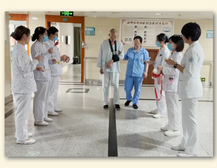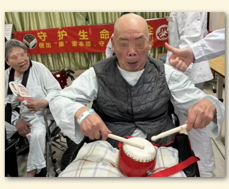 在这场独特的“音乐派对”中,康复训练变得不再单调。患者们随着音乐的节奏,用各种方式进行锻炼。有的患者用患肢努力抬起木鱼,随着节拍敲打,每一次敲击都是对健康的渴望与追求;肌力稍差的患者也不甘示弱,尝试着抬起患肢,颤颤抖抖地晃动快板,那清脆的响声传递着他们不屈的斗志;上肢肌力恢复不错的患者则微微摆动身体,将手摇铃举过头顶,随着音乐摇动,仿佛在为自己的康复之路加油鼓劲。