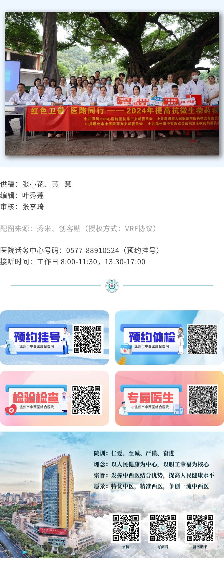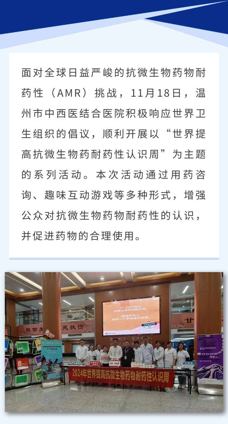 据悉,自2015年起,世界卫生组织将每年的11月18日至24日定为“世界提高抗微生物药物耐药性认识周”,以唤起全球对AMR问题的关注。今年,医院不仅在院内开展“世界提高抗微生物药耐药性认识周”系列活动,而且联合市级三所医院在红日亭开展药物科普宣教活动,深受市民欢迎,并赢得了广泛赞誉,有效地提升了公众的用药安全意识,同时也为构建健康温州的宏伟目标贡献中西医力量。
