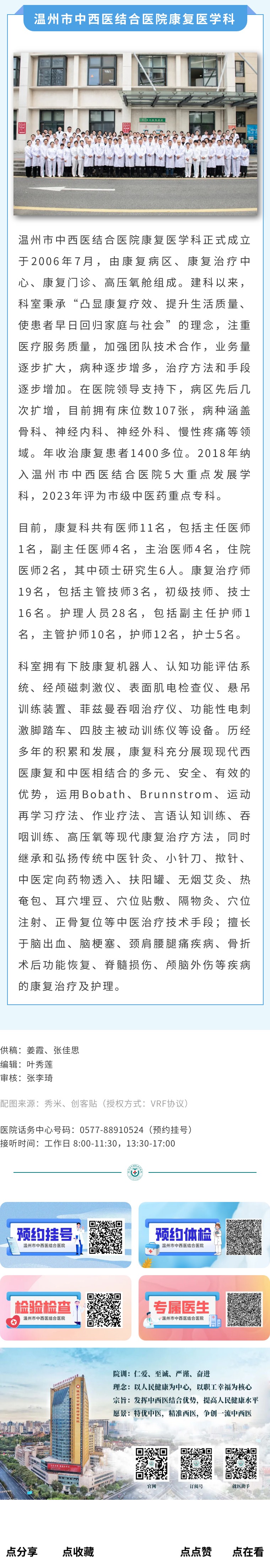 搬迁后的康复医学科规模扩大,拥有位于2号楼6楼和7楼两个病区,床位总数增至100余张。同时,科室配备了中医综合治疗室、运动治疗室、物理因子治疗室、作业治疗室以及吞咽言语治疗室,形成了独具特色的中世界杯买足球球app康复诊疗体系。此外,为满足患者的营养需求,科室还特设食物制作调配室,为广大患者朋友提供更加细致周到的医疗健康服务。