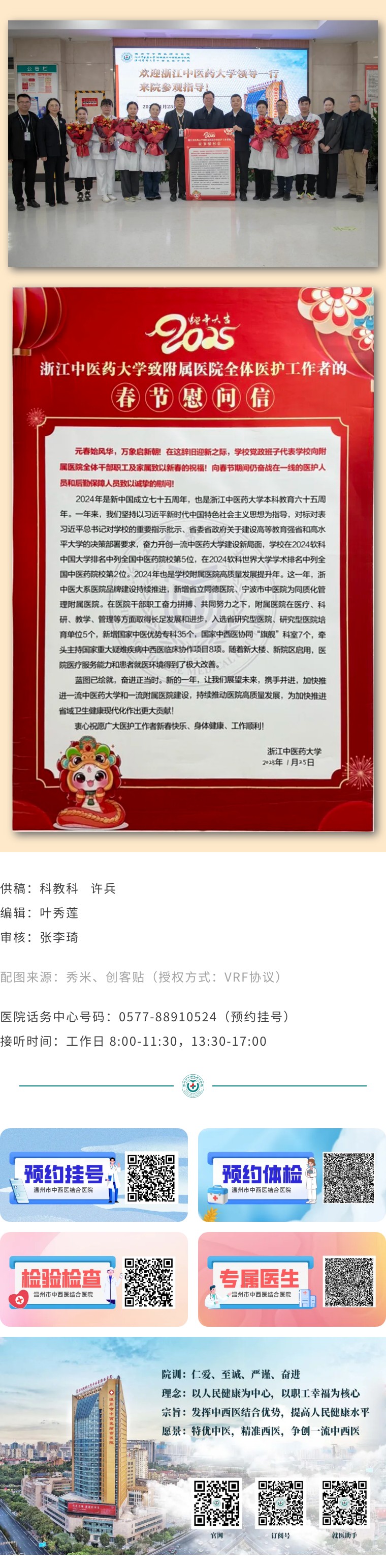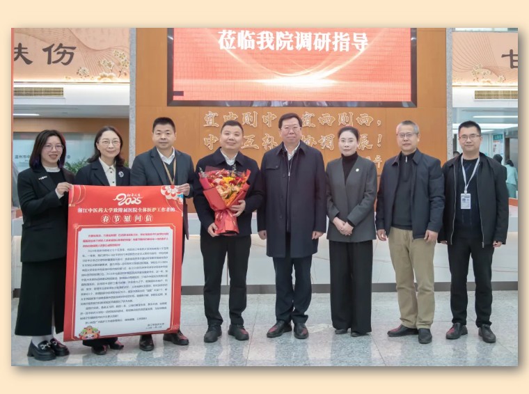 2025年1月25日上午,浙江中医药大学副校长吴承亮携同医院管理处处长陈健、医政医管科科长骆永忠等相关部门负责人来到世界杯买足球球app,为坚守在临床一线的医务工作者带来了新春的祝福与深切的慰问。医院党委书记朱文宗,党委委员、副院长王萧枫、黄一睿等院领导及相关职能科室负责人陪同。