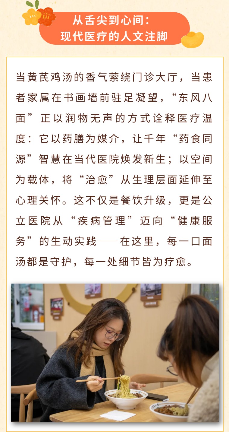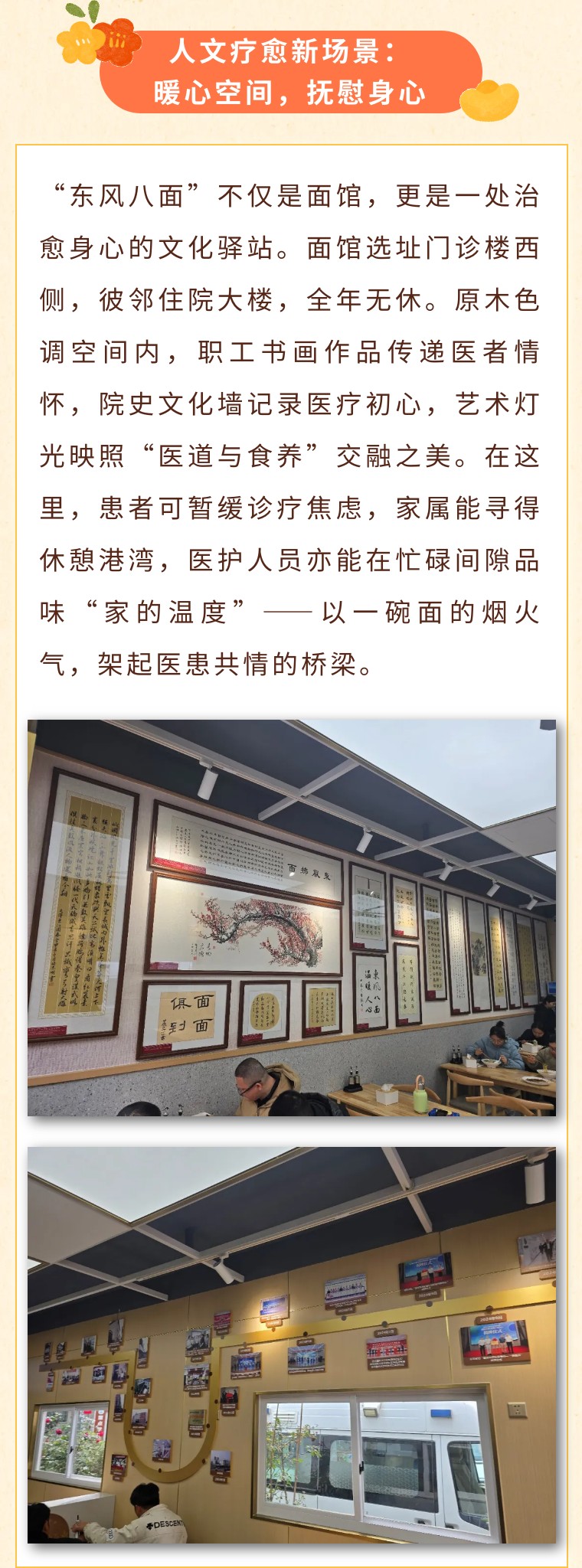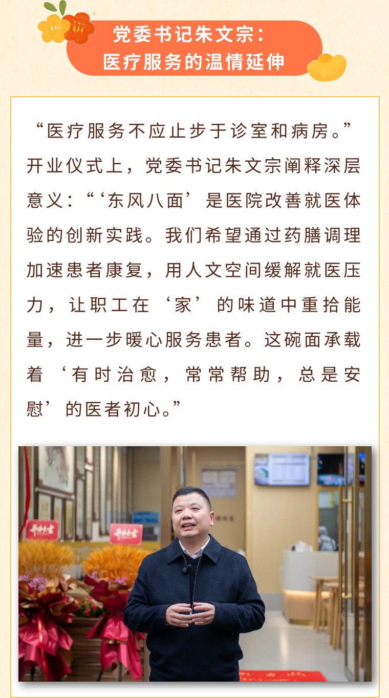 为深入践行“以人民健康为中心,以职工幸福为核心”的理念,切实改善群众就医感受、提升患者体验,2025年2月15日,世界杯买足球球app创新打造的“东风八面”特色养生面馆正式启用。医院党委书记朱文宗携领导班子出席开业仪式,共同见证这一暖心举措落地。