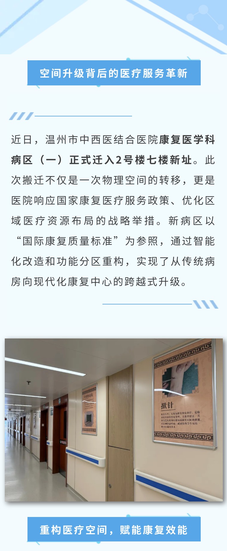 作为温州市康复医疗服务网络的重要节点,此次搬迁同步强化了与社区卫生中心、医养机构的双向转诊机制。搬迁后的康复医学科规模扩大,拥有位于2号楼6楼和7楼两个病区,床位总数增至100余张,可服务更多转诊的患者,进一步推动“急重症—康复—社区”分级诊疗闭环的形成。