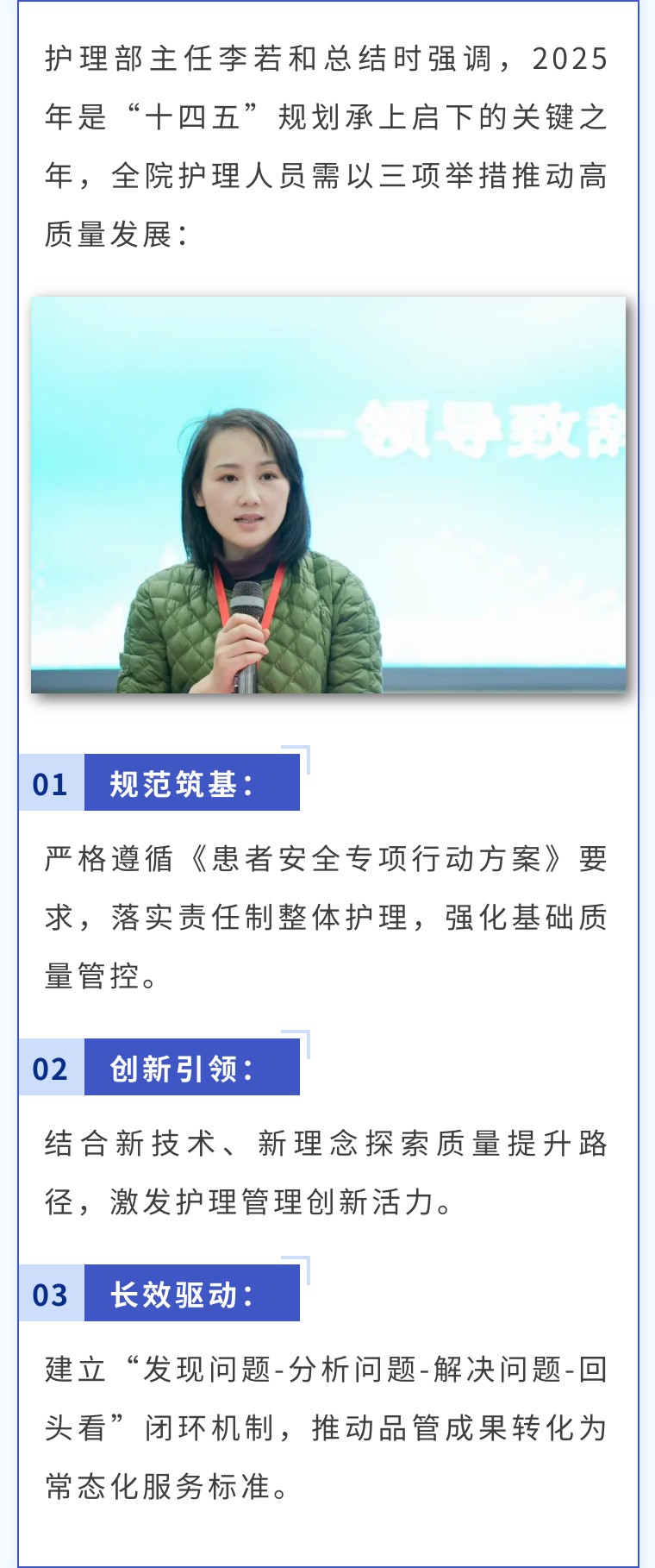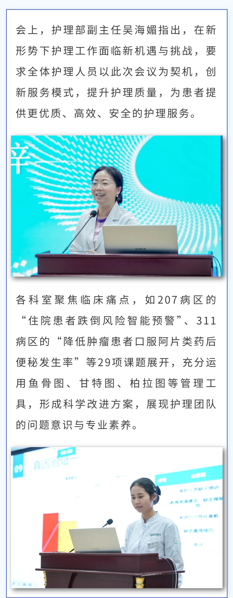 本次会议为护理人员搭建了交流学习平台,进一步凝聚质量共识。医院护理团队将以实际行动践行“以患者为中心”的服务理念,为推进医院高质量发展、守护群众生命健康持续贡献力量。