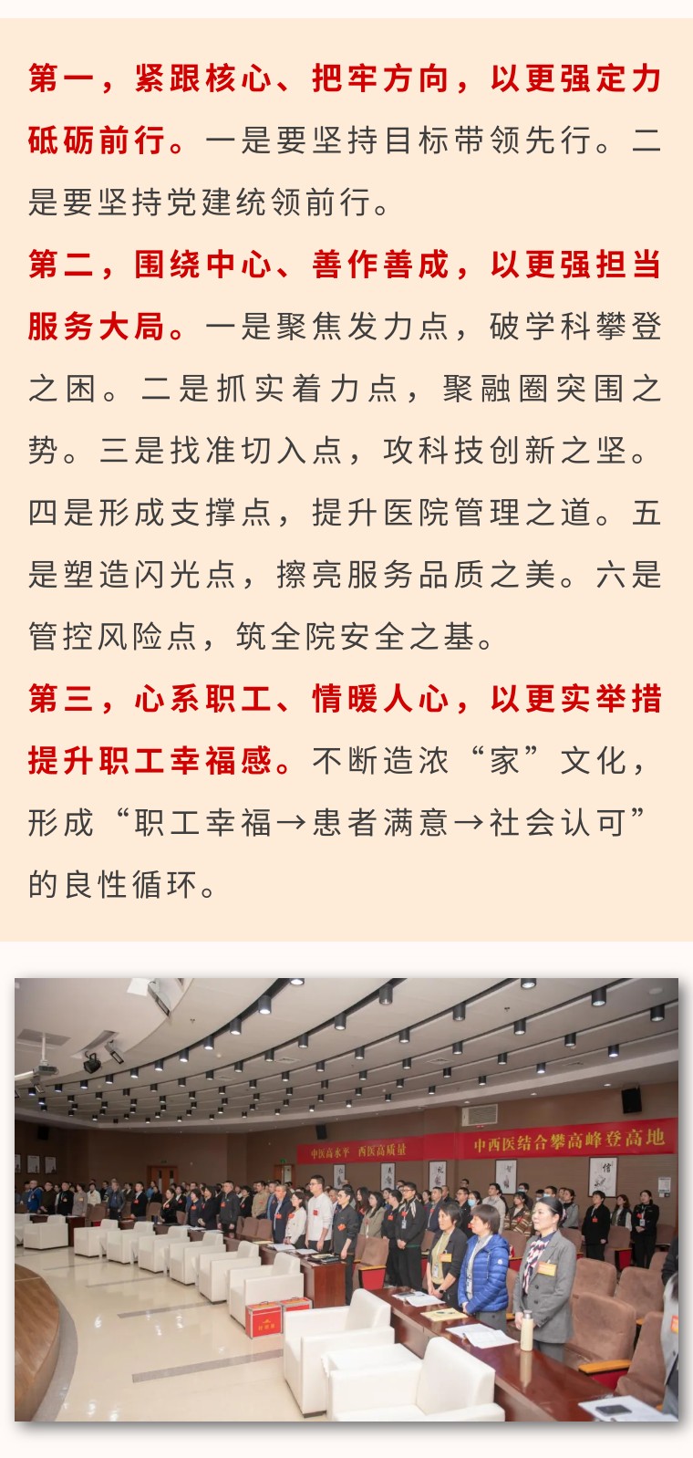 受党委书记朱文宗所托,党委副书记、院长姜文兵作总结讲话。姜文兵指出,本次会议内涵丰富、主题鲜明、安排周密、气氛热烈,这是一次高举旗帜、团结奋进的再动员,更是一次统一思想、凝聚力量的再部署,向善谋善为的中西医团队致以崇高礼赞,希望在未来的日子里,中西医人以“起步即冲刺”的竞跑姿态,在争创标杆的新征程中,既要闻令而动抓执行,更要对标一流勇争先。努力做到以下几点: