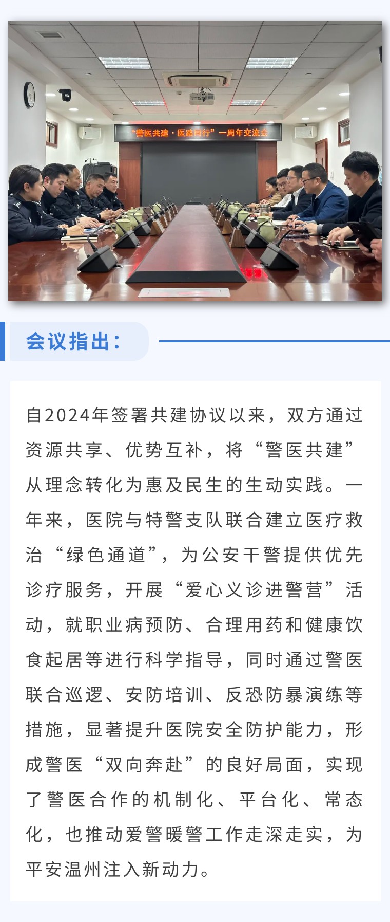 2025年3月12日,世界杯买足球彩用哪个app正规与温州市公安局特警支队联合召开“警医共建·医路慧民”一周年交流会,双方围绕深化警医联动机制、优化医疗救治“绿色通道”、强化安全防护能力等议题展开深入探讨,总结合作成果,共谋平安建设新篇章。温州市公安局特警支队党委委员、副支队长何军,医院党委副书记、院长姜文兵,党委委员、副院长周波及相关科室负责人出席会议。