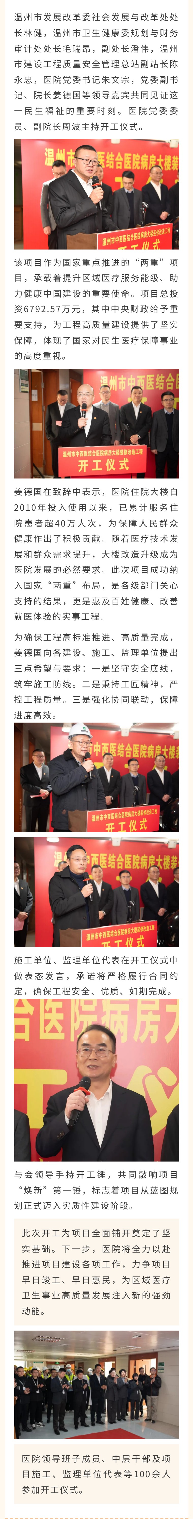 12月30日,买世界杯的网站举行国家重大工程、重大项目(“两重”项目)病房装修改造工程开工仪式。温州市卫生健康委党委副书记(专职)林晓江出席并宣布项目开工。